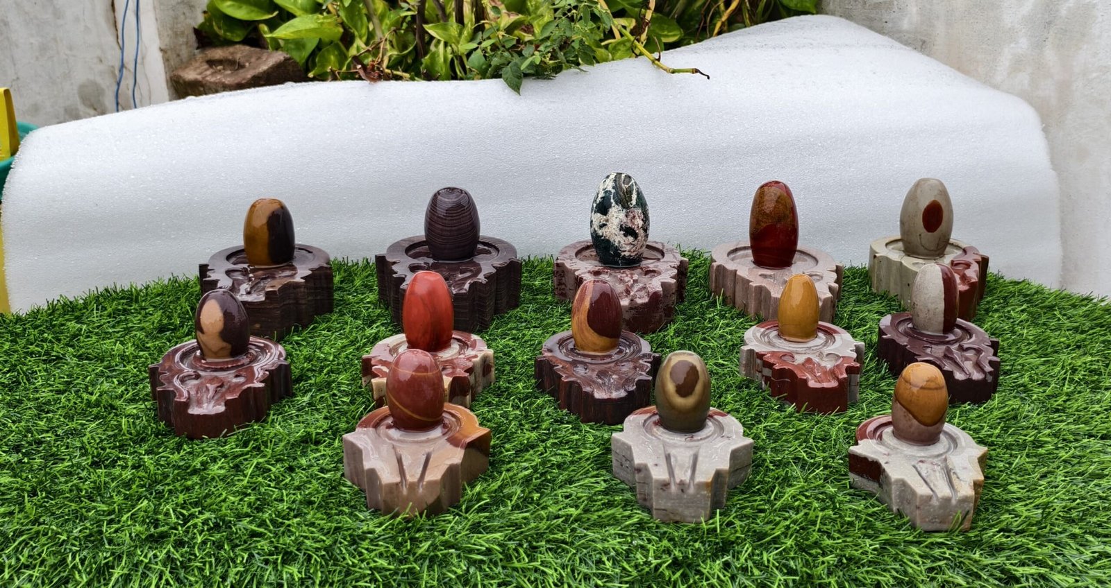 This assorted collection of Narmadeshwar Shivlings features naturally formed sacred stones from the Narmada river, each mounted on beautifully carved stone jaladharis. The Shivlings exhibit stunning multicolor patterns, including earthy browns, maroons, creams, and greens, making every piece unique. Ideal for home temples, meditation spaces, Rudrabhishek ceremonies, and festive occasions like Maha Shivratri, these Shivlings bring divine blessings and spiritual energy to any setting.