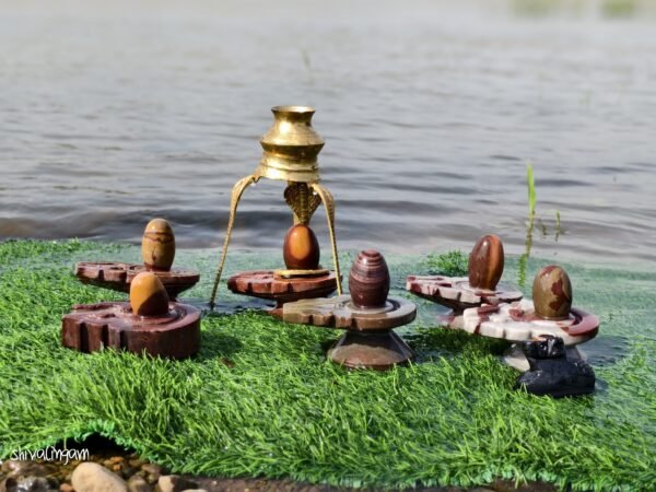 This miniature Narmadeshwar Shivling set includes naturally formed Shivlings mounted on carved stone jaladharis, paired with a brass abhishek pot for ritual water offering. The Shivlings display beautiful natural patterns in brown, red, and white tones, symbolizing the cosmic energy of Lord Shiva. Ideal for compact home temples, travel puja kits, and spiritual gifting, this set allows devotees to perform daily worship and Rudrabhishek anywhere with ease.
