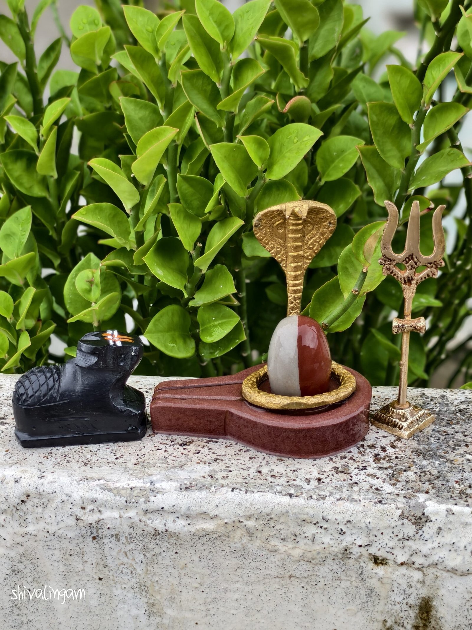 Bring divine blessings and serenity into your home with this handcrafted Narmadeshwar Shivling set. The Shivling is naturally formed from the sacred Narmada river stones and is paired with a brass Trishul, brass Naag (serpent), and black Nandi idol, symbolizing the complete presence of Lord Shiva. The base is polished for a smooth finish, making it ideal for daily puja, Shivratri rituals, and gifting purposes. Perfect for home temples, offices, and meditation spaces.