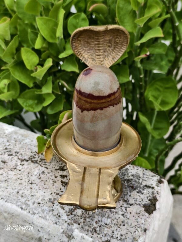 This Narmadeshwar Shivling is naturally formed from sacred Narmada river stones and is set in a finely crafted brass jaladhari with a cobra hood. The stone’s natural brown and cream pattern symbolizes harmony and divine energy, while the brass base adds elegance and durability. Perfect for daily worship, Rudrabhishek, and auspicious occasions like Maha Shivratri and housewarming ceremonies, this Shivling is ideal for home temples and spiritual gifting.