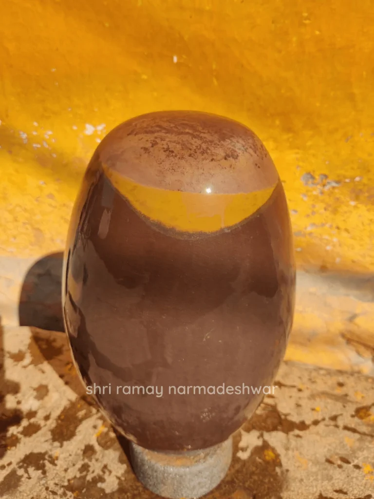The Tilak Dhari Narmadeshwar Shivling is a sacred and rare formation of the Narmadeshwar Shivling, featuring a natural tilak-like mark formed by divine geological processes. This distinctive yellow-orange tilak, set against the rich brown surface of the stone, is seen as a divine symbol of Lord Shiva’s blessing.
