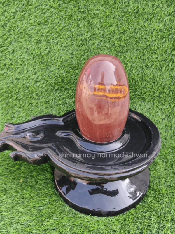 Seated on a beautifully crafted black stone Yoni base, the Shivling’s radiant tilak pattern stands out against the deep reddish-brown body—making it a visually powerful and spiritually charged addition to any home temple or meditation space.