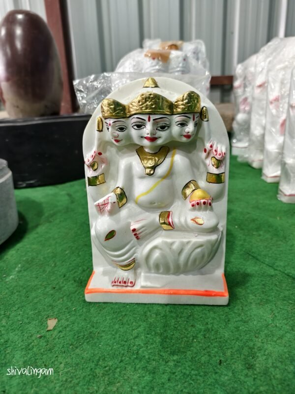 This white marble Goddess Dattatreya idol is intricately handcrafted and adorned with delicate gold-painted details, symbolizing divine grace and blessings. The idol features three serene faces, representing spiritual harmony and universal energy. Perfect for home temples, meditation spaces, and festive gifting, it embodies peace, wisdom, and devotion. Ideal for puja during auspicious occasions and daily worship.